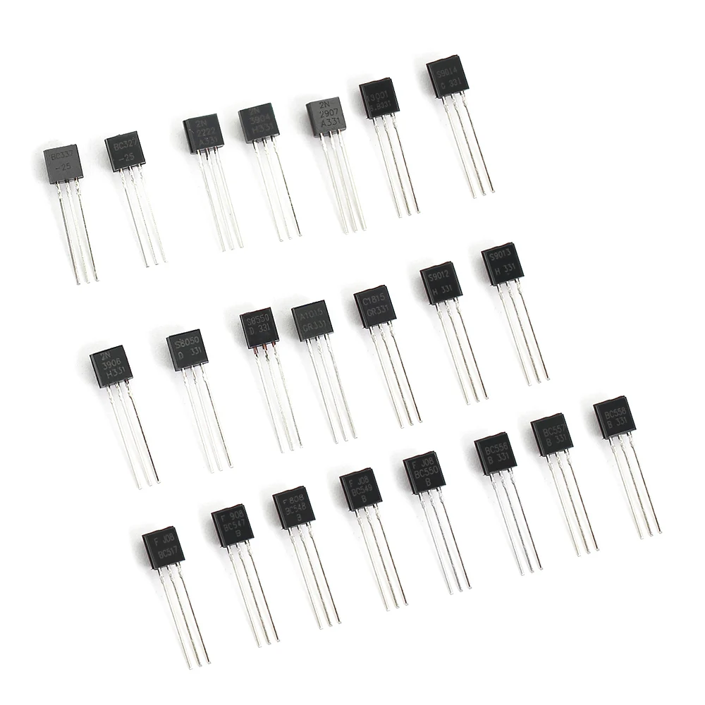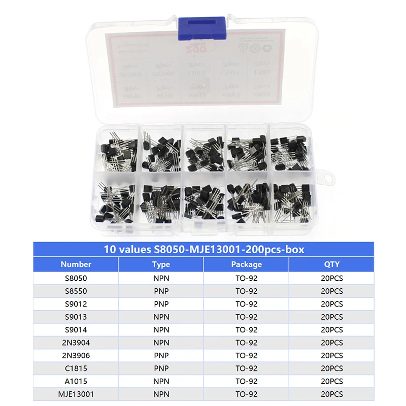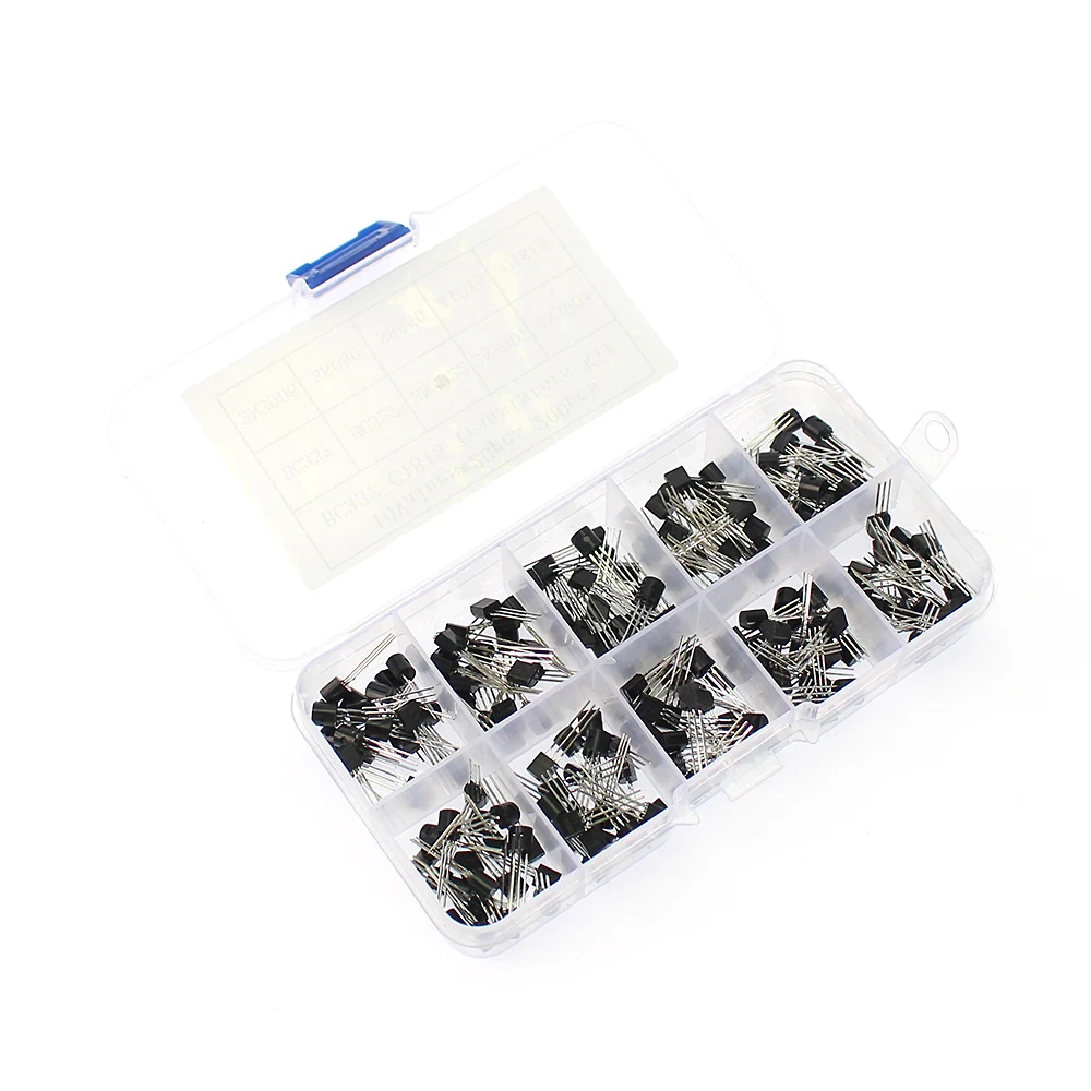 New BJT transistor Features: small size, no consumption of components, little power consumption, no preheating, large working voltage range, solid and reliable. In analog circuits, transistors are used for amplifiers, audio amplifiers, radio frequency amplifiers, voltage stabilizing circuits; In computer power supply, it is mainly used for switching power supply. Transistor Kit Box 10 value * 20PCS 1.BC327-BC558-200PCS BC327 BC337 BC517 BC547 BC548 BC549 BC550 BC556 BC557 BC558 2.S8050-MJE13001-200PCS S8050 S8550 S9012 S9013 S9014 2N3904 2N3906 C1815 A1015 MJE13001 3.BC327-C1815-200PCS BC327 BC337 2N2222 2N2907 2N3904 2N3906 S8050 S8550 A1015 C1815